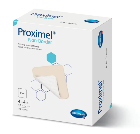 O curativo de espuma de silicone PROXIMEL® NON BORDER consiste em um curativo de silicone composto por três camadas sendo elas: uma camada superior protetora em filme de poliuretano à prova d'água e permeável ao vapor, uma camada de espuma absorvente de poliuretano e uma camada perfurada de contato com a ferida em silicone.