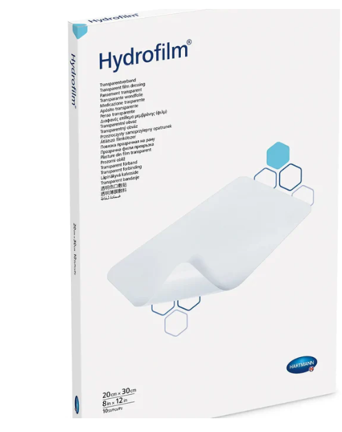 Hydrofilm é uma película adesiva transparente em poliuretano com adesivo acrilato estéril, semipermeável, à prova de água, que proporciona proteção contra a penetração de bactérias; com adesivo hipoalergênico.